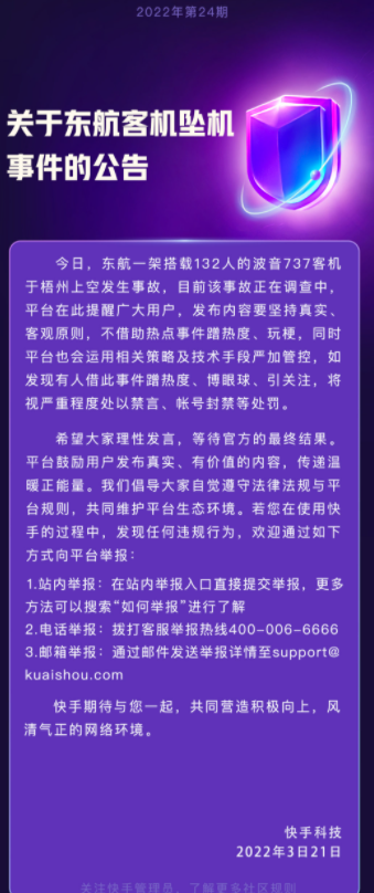 MU5735客机事件牵动人心,多个内容平台严打蹭热点、博眼球行为: