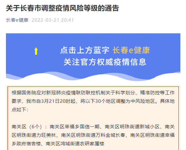 根据国务院应对新冠肺炎疫情联防联控机制关于科学划分、精准防控等工作要求,我市自3月21日20时起,将以下30个地区调整为中风险地区。具体地点如下: