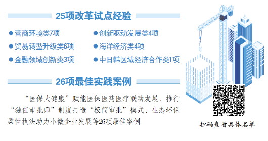 《通知》明确,山东省自贸试验区探索出的25项创新性高、影响面较广的创新成果,将作为改革试点经验在全省复制推广。分别为:增值税留抵退税确认制、产业规划编制和产业用地管理制度创新等7项营商环境类经验;“链上自贸”保税展销辅助监管系统集成拓展、集装箱进口“船到直提”出口“抵港直装”等6项贸易转型升级类经验;加工贸易海关担保事务履约保证保险“三方合作”新模式等3项金融领域创新类经验;备案制中医诊所发展新模式、知识产权保护中心公益性服务全流程标准化改革等4项创新驱动发展类经验;海事“云登轮”船舶远程监管工作新机制等4项海洋经济类经验,以及以企业为单元简化原产地资格担保手续提高中韩自贸协定享惠率这一项中日韩区域经济合作类经验。