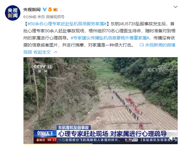 【50余名心理专家赶赴坠机现场服务家属】东航MU5735坠毁事故发生后,首批心理专家50余人赶赴事故现场,梧州组织70名心理医生待命,随时准备对到梧州的家属进行心理疏导。专家建议传播坠机信息要格外尊重家属,传播没有依据的信息或者图片,并进行揣摩,对家属是一种很大打击。