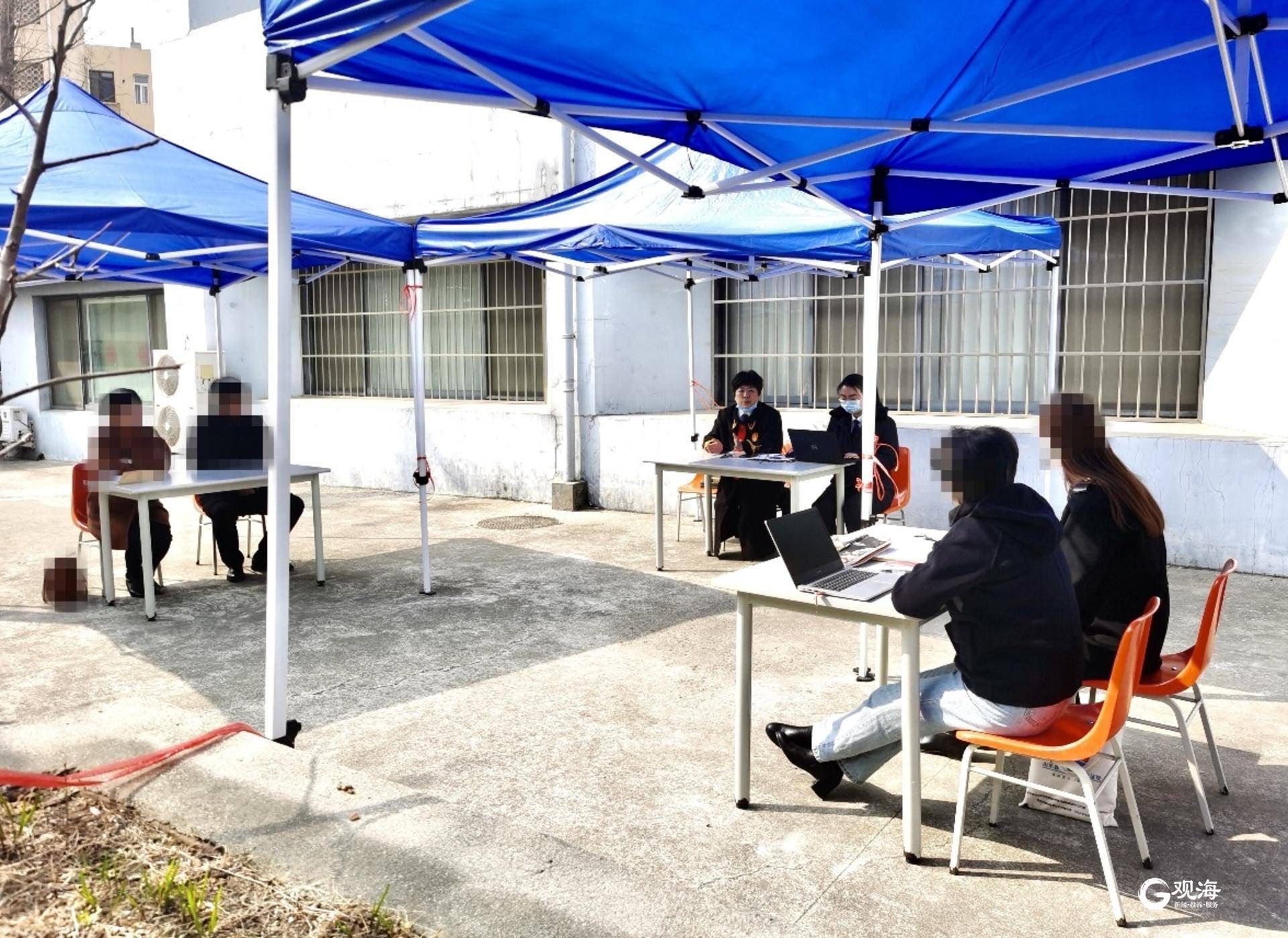 本案一起涉及财产数额巨大的离婚纠纷,原、被告共同注册经营数十家公司,涉案标的价值上亿元,相关证据之多可想而知。经过团队长赵洁庭前对案件的综合研判,认为若采取防疫当下速裁案件普遍采用的互联网线上庭审方式,势必会增加本案证据交换难度,且难以保障离婚当事人隔着屏幕实现情感的充分表达,于是她第一时间与综合办公室联系,申请到了“帐篷法庭”,在院区内通风的广场帐篷下开庭审理。