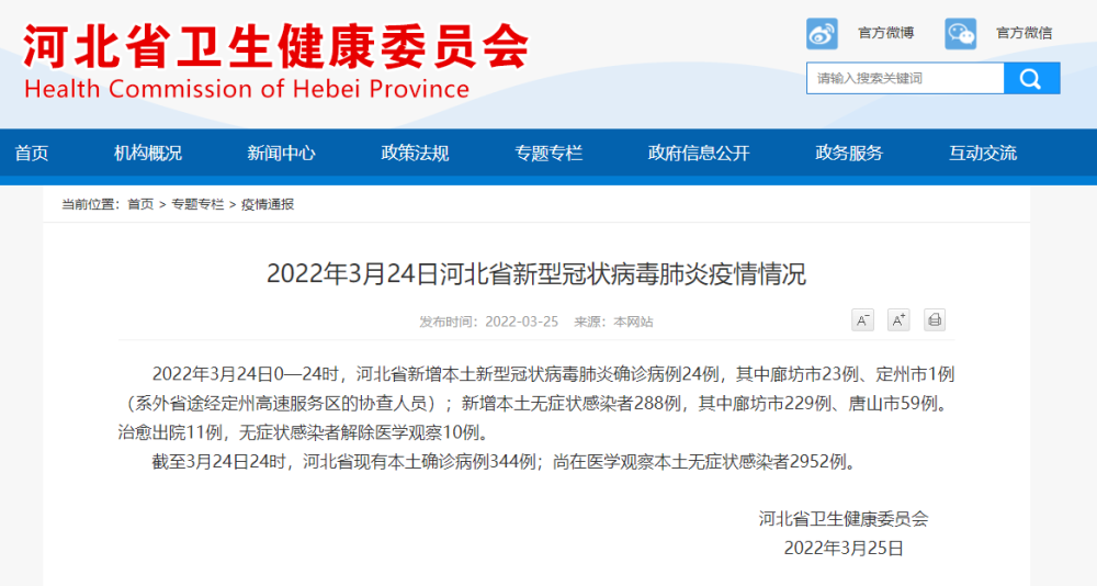 2022年3月24日0—24时,河北省新增本土新型冠状病毒肺炎确诊病例24例,其中廊坊市23例、定州市1例(系外省途经定州高速服务区的协查人员);新增本土无症状感染者288例,其中廊坊市229例、唐山市59例。治愈出院11例,无症状感染者解除医学观察10例。