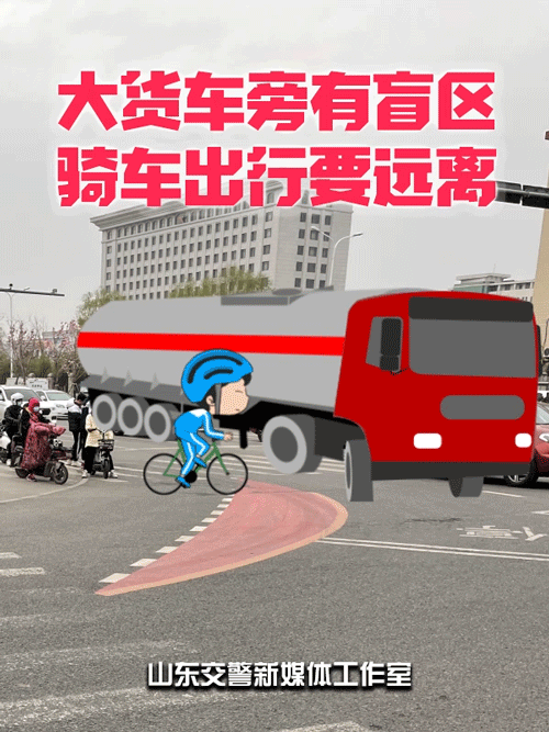 大货车旁有盲区,骑车出行要远离。