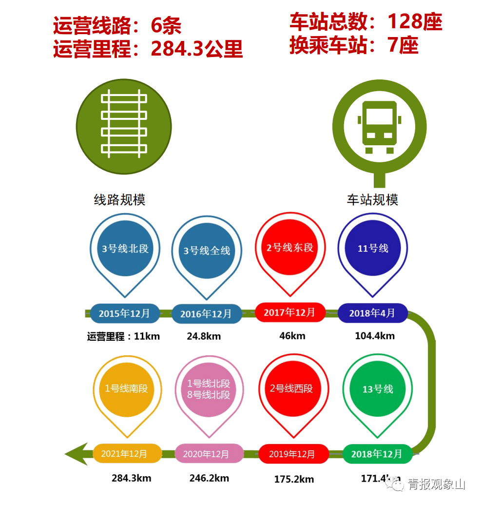 从2015年12月青岛地铁3号线北段开通到2021年12月1号线全线开通,从最初的11公里到现在的284公里,青岛地铁线网规模扩张迅速,线网优势逐年放大。