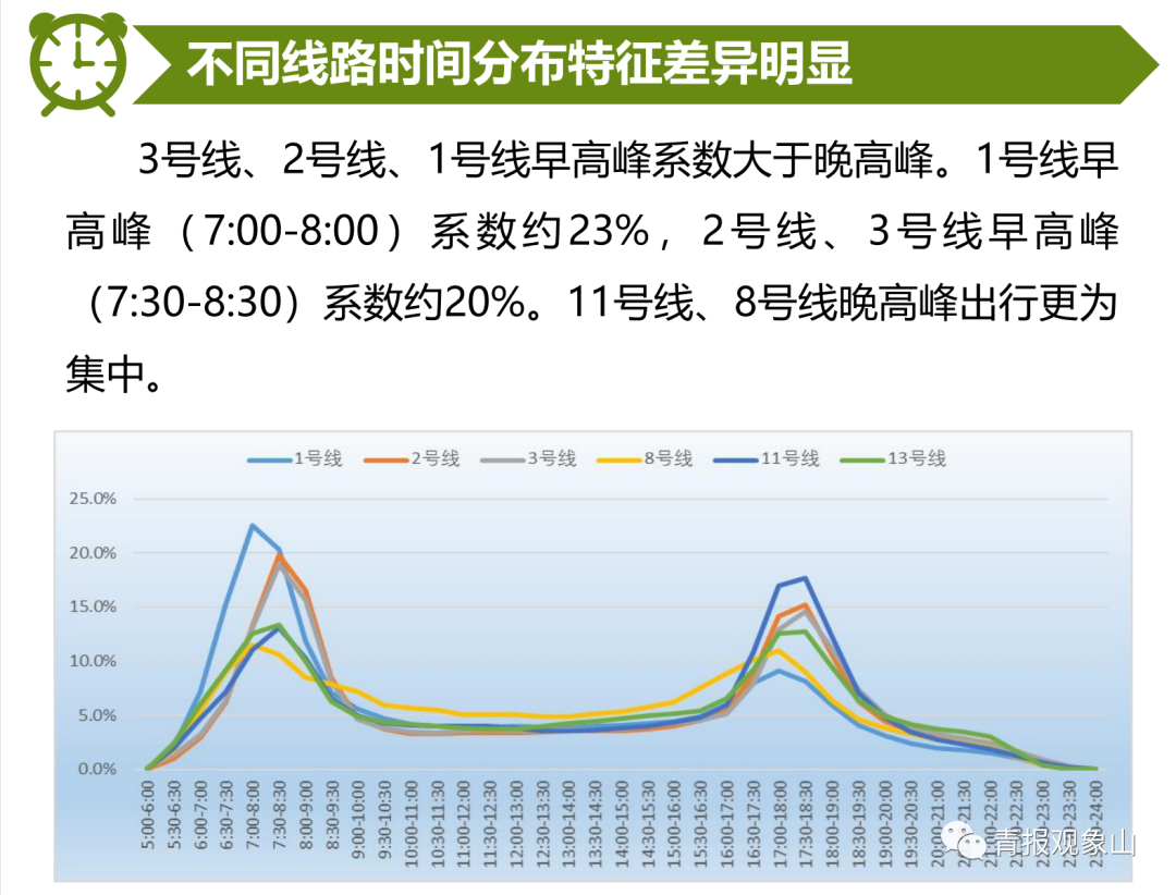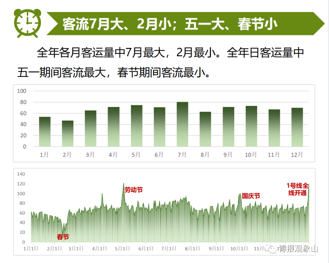 纵观全年客流分布,有着一定的季节性:各月客运量中,7月最大、2月最小;日客运量中“五一”假期客流最大,春节期间客流最小;旅游季节(5月—10月)日均客运量达到72.6万人次,较非旅游季节(其他月份)的62.5万人次多出约16.2%。