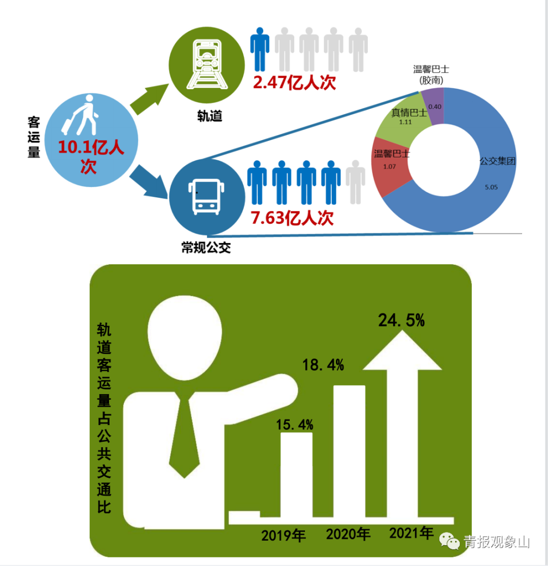 报告透露,2021年青岛公共交通(东岸城区、北岸城区和西海岸新区)客运量达10.1亿人次,其中轨道交通2.47亿人次,占比约1/4。从2019年的15.4%,到2020年的18.4%,再到2021年一跃增长到24.5%,轨道交通客运量占公共交通比例逐年攀升。
