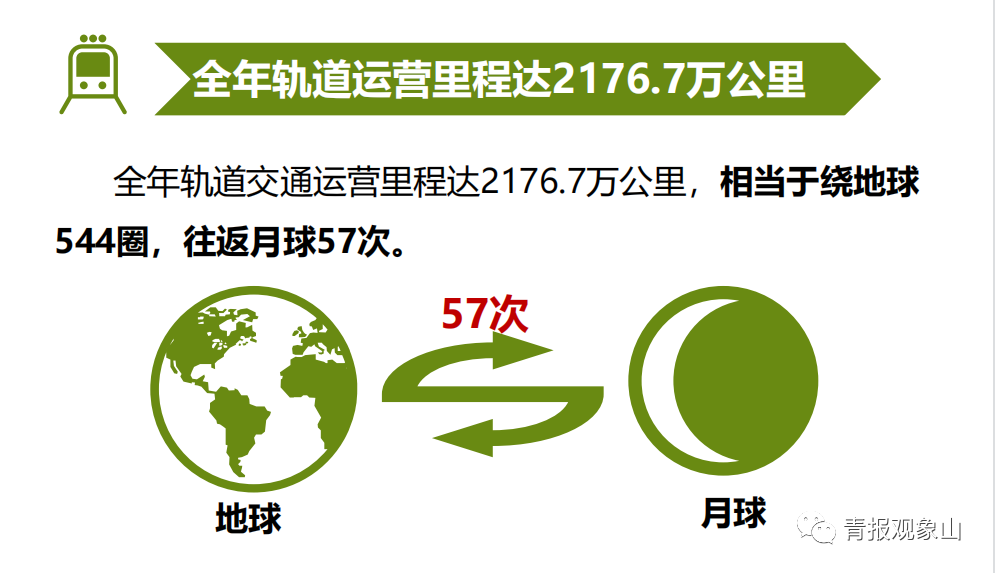 全年轨道交通运营里程达2176.7万公里,相当于绕地球544圈,往返月球57次;