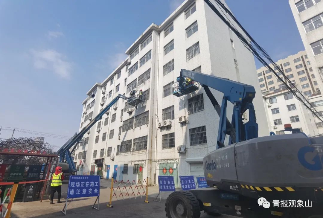 在胶州市新立街小区,工人们正在拆除居民楼上的附着物。