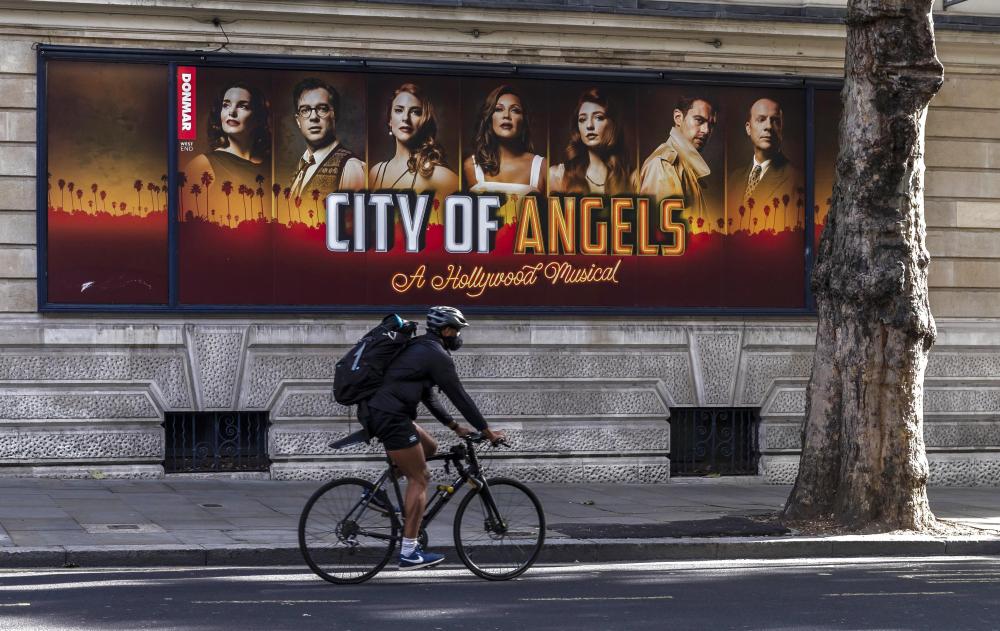 ↑9月28日,一名男子骑车从英国伦敦西区的音乐剧广告前经过。新华社记者 韩岩摄