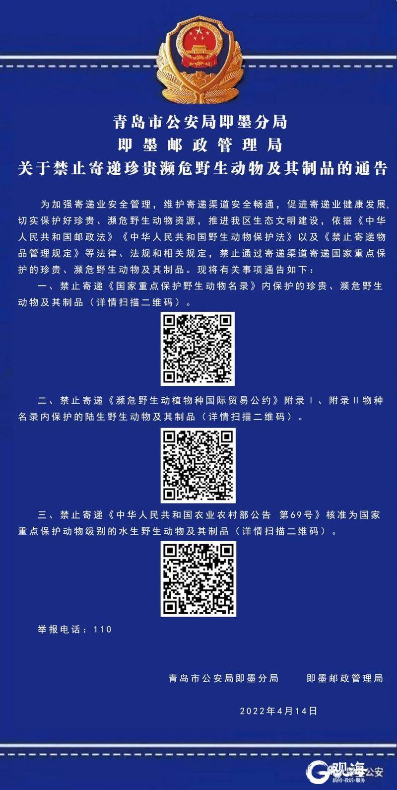 青岛日报社/观海新闻4月17日讯 为加强寄递业安全管理,维护寄递渠道安全畅通,促进寄递业健康发展,切实保护好珍贵、濒危野生动物资源,推进即墨区生态文明建设,青岛市公安局即墨分局、即墨邮政管理局依据《中华人民共和国邮政法》《中华人民共和国野生动物保护法》以及《禁止寄递物品管理规定》等法律、法规和相关规定,禁止通过寄递渠道寄递国家重点保护的珍贵、濒危野生动物及其制品。