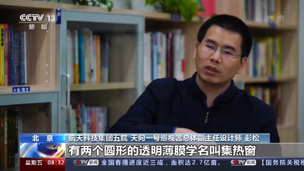 航天科技集团五院 天问一号巡视器总体副主任设计师 彭松:(火星车)翅膀中间的车本体的顶板上面,有两个圆形的透明薄膜学名叫集热窗,就是阳光通过膜照进去之后能把热量留在火星车的舱内,但是现在如果蒙一层灰的话,可能透进去的阳光就变少了,然后它收集的热量就少了,最终影响的还是能源的情况。