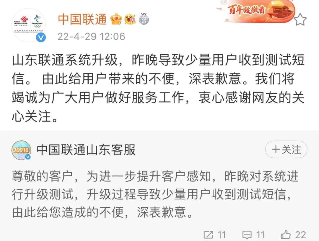 4月29日上午,@中国移动 回应:经协同中国联通核实,原因为中国联通山东分公司进行系统升级测试所致,中国联通在定位原因后已迅速进行了相应处置。