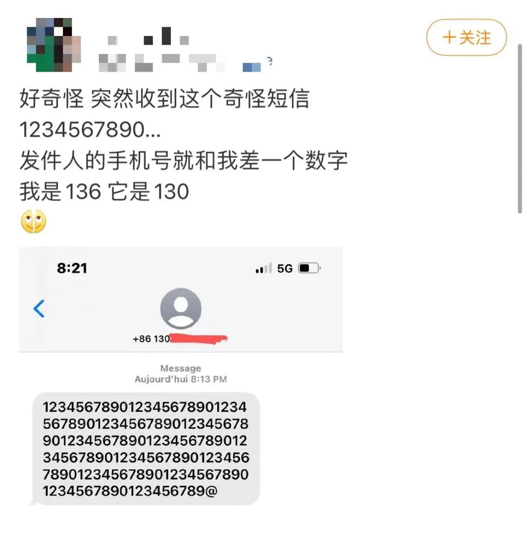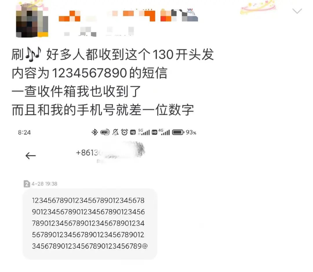 短信内容是一连串“1234567890”的重复数字,以@结尾。值得注意的是,发送短信的号码多以“130”开头,且余下号码与机主手机号一致。