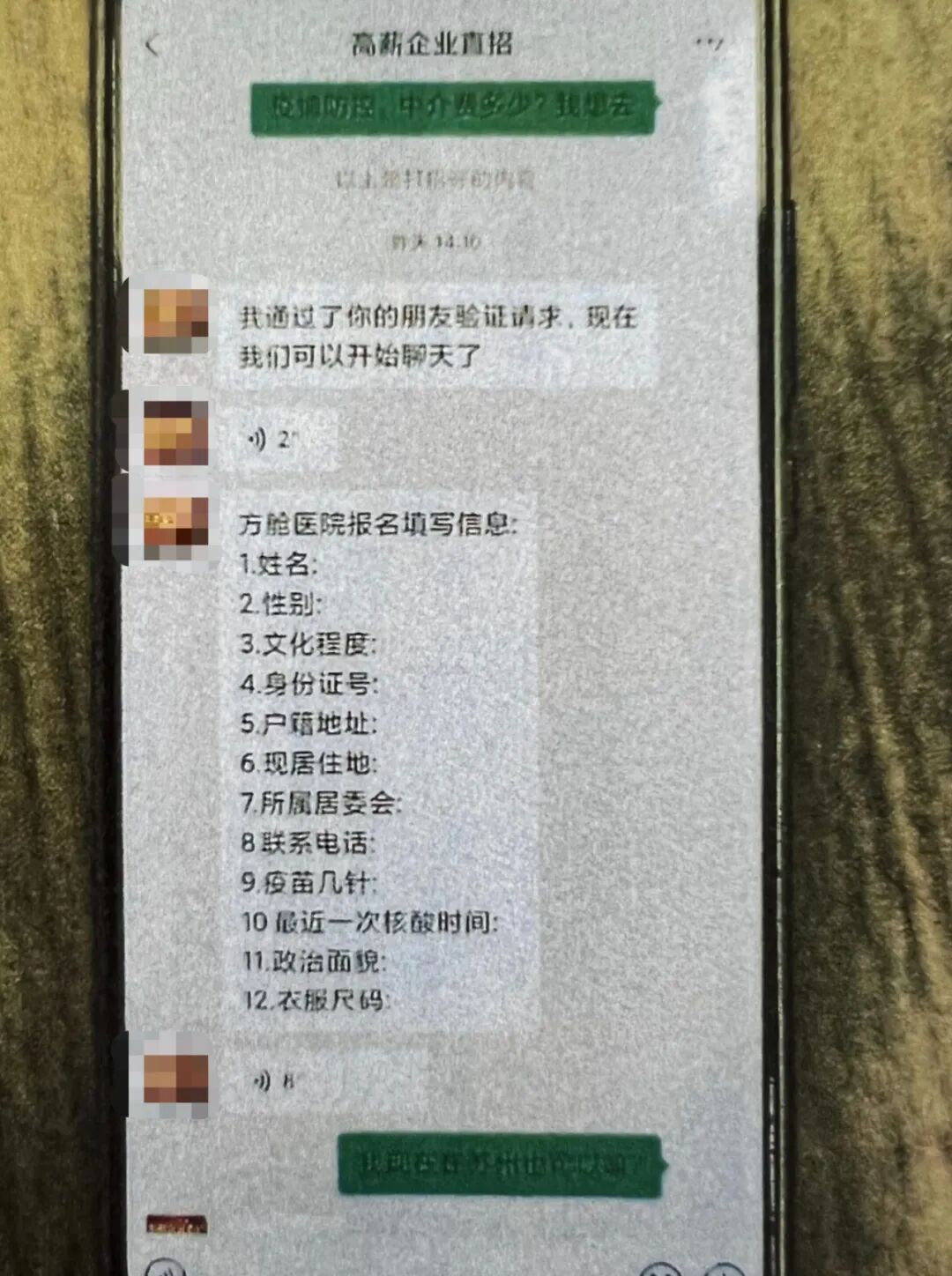 据小薛讲述,他在网上看到有人发布“招募方舱志愿者”的信息,觉得既能帮忙也能赚钱,便添加信息发布者的微信进一步详聊。