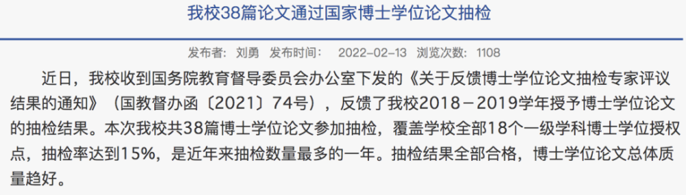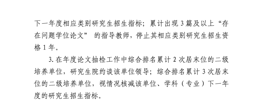 学校有1位导师因去年指导的1篇学位论文被1位专家评价为“不合格”,此次被追踪抽检了3篇学位论文,该导师所在的学位点论文抽检比例也被提高。