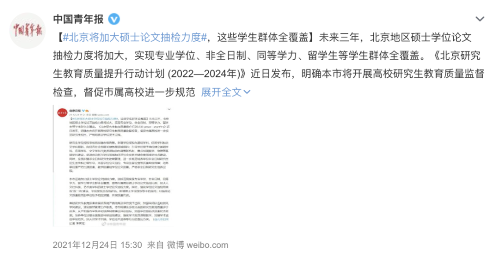 2021年12月,北京市教委印发《北京研究生教育质量提升行动计划(2022—2024年)》,要求加大北京地区硕士学位论文抽检力度,抽检范围实现专业学位、非全日制、同等学力、留学生等学生群体全覆盖。