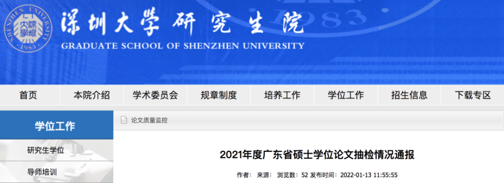此外,在广东省硕士学位论文抽检中,深圳大学共被抽检110篇硕士学位论文,没有“存在问题”学位论文,有1位专家评议意见为“不合格”的学位论文5篇。
