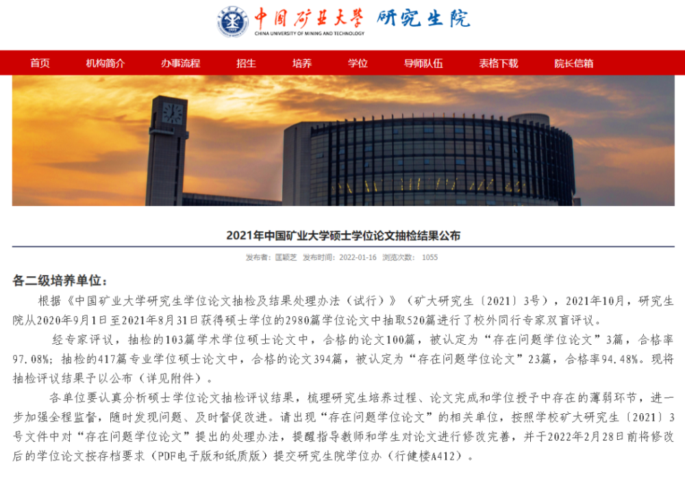 据澎湃新闻消息,1月16日,中国矿业大学研究生院公布2021年中国矿业大学硕士学位论文抽检结果。