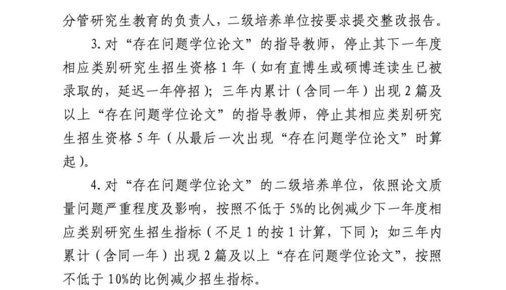 2021年9月,在教育部新闻发布会上,四川省教育厅总督学傅明表示,2021年起,四川对高校硕士研究生论文抽检结果存在问题的9所高校,相应调减当年研究生招生计划108人。