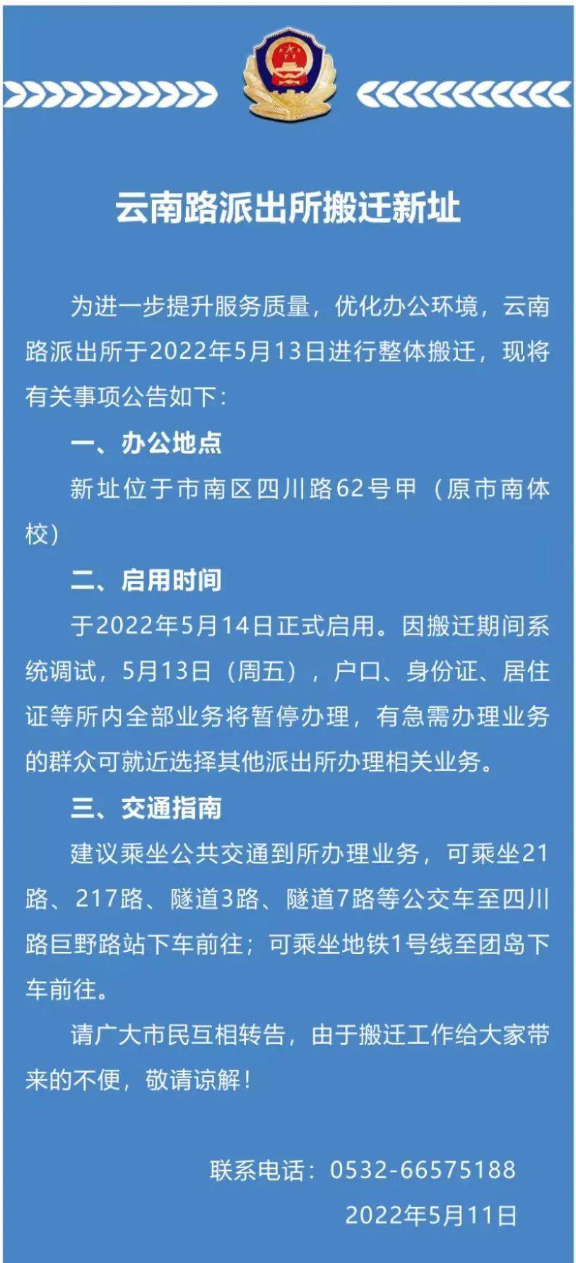 青岛日报社/观海新闻5月12日讯 市公安局市南分局发布关于云南路派出所搬迁的公告。为进一步提升服务质量,优化办公环境,云南路派出所于5月13日进行整体搬迁,新址位于市南区四川路62号甲(原市南体校),并于5月14日正式启用。(青岛日报/观海新闻记者 梁超)