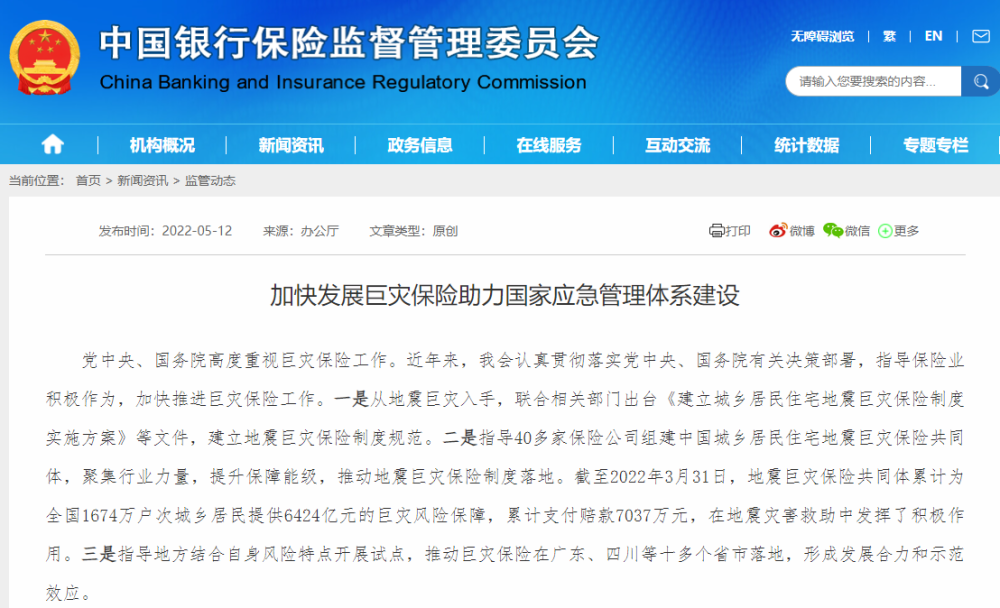 党中央、国务院高度重视巨灾保险工作。近年来,我会认真贯彻落实党中央、国务院有关决策部署,指导保险业积极作为,加快推进巨灾保险工作。一是从地震巨灾入手,联合相关部门出台《建立城乡居民住宅地震巨灾保险制度实施方案》等文件,建立地震巨灾保险制度规范。二是指导40多家保险公司组建中国城乡居民住宅地震巨灾保险共同体,聚集行业力量,提升保障能级,推动地震巨灾保险制度落地。截至2022年3月31日,地震巨灾保险共同体累计为全国1674万户次城乡居民提供6424亿元的巨灾风险保障,累计支付赔款7037万元,在地震灾害救助中发挥了积极作用。三是指导地方结合自身风险特点开展试点,推动巨灾保险在广东、四川等十多个省市落地,形成发展合力和示范效应。