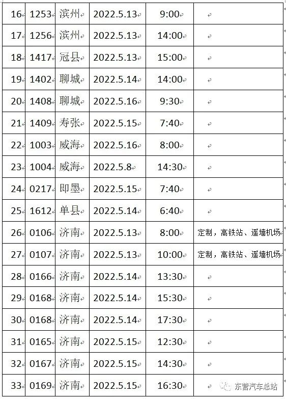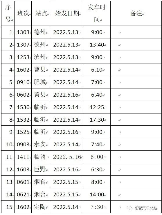 2022年5月13日起,东营汽车总站发往烟台、济南、德州、聊城等方向的多班次陆续恢复,恢复列表如下: