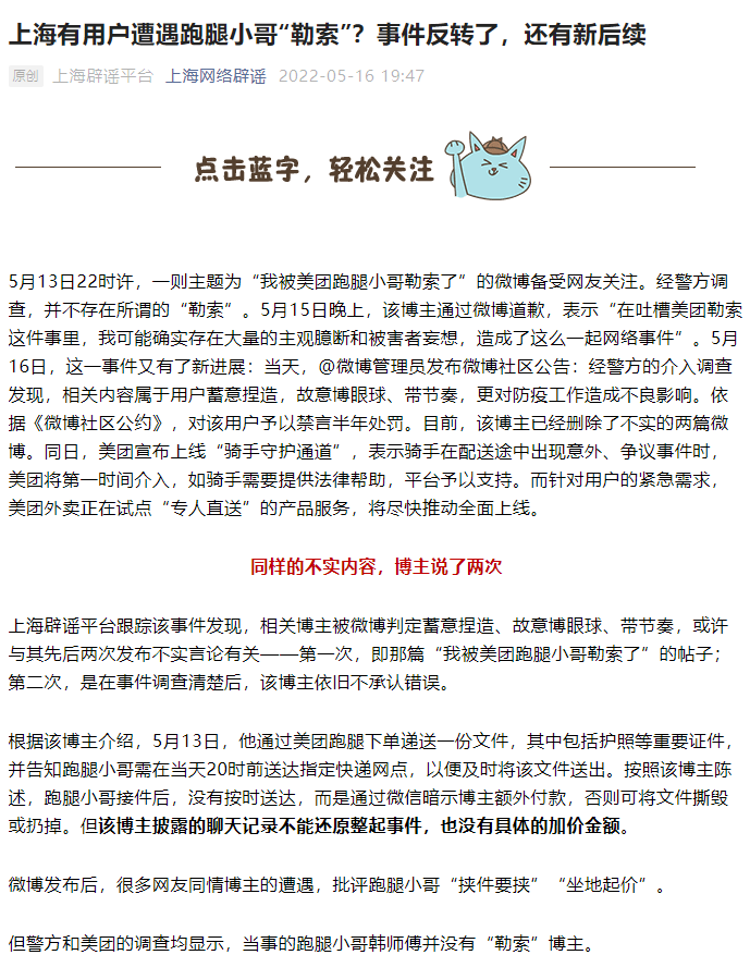 5月13日22时许,一则主题为“我被美团跑腿小哥勒索了”的微博备受网友关注。经警方调查,并不存在所谓的“勒索”。5月15日晚上,该博主通过微博道歉,表示“在吐槽美团勒索这件事里,我可能确实存在大量的主观臆断和被害者妄想,造成了这么一起网络事件”。5月16日,这一事件又有了新进展:当天,@微博管理员发布微博社区公告:经警方的介入调查发现,相关内容属于用户蓄意捏造,故意博眼球、带节奏,更对防疫工作造成不良影响。依据《微博社区公约》,对该用户予以禁言半年处罚。目前,该博主已经删除了不实的两篇微博。同日,美团宣布上线“骑手守护通道”,表示骑手在配送途中出现意外、争议事件时,美团将第一时间介入,如骑手需要提供法律帮助,平台予以支持。而针对用户的紧急需求,美团外卖正在试点“专人直送”的产品服务,将尽快推动全面上线。