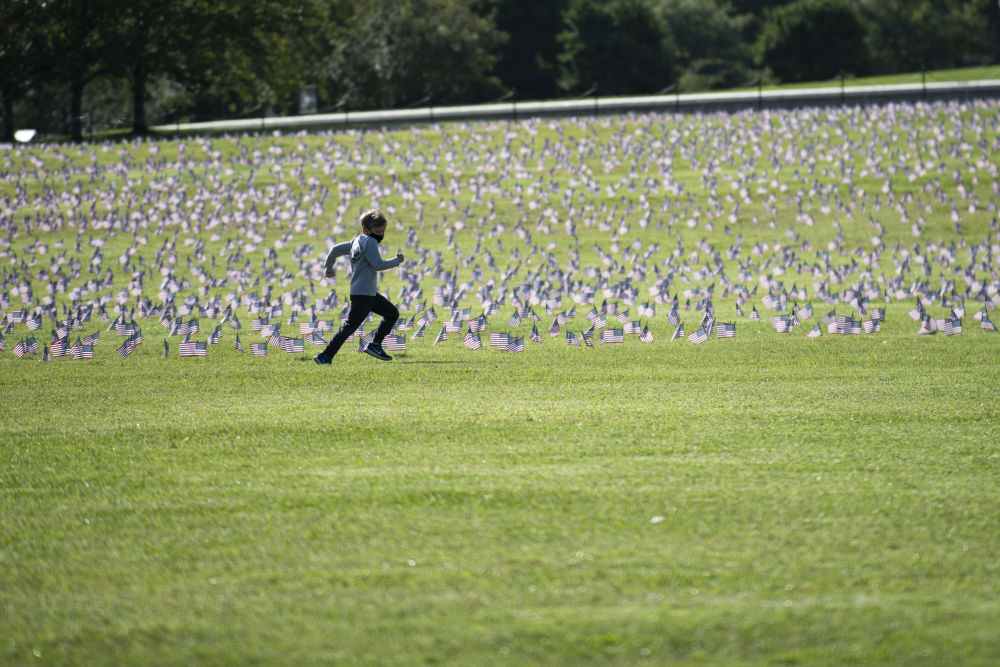 9月22日,在美国首都华盛顿,一名男孩从草坪上的美国国旗旁跑过。新华社记者刘杰摄