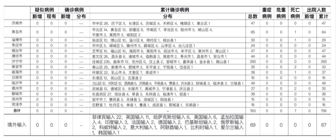 山东无本地住院疑似病例、确诊病例。累计报告确诊病例763例,死亡7例,治愈出院756例。