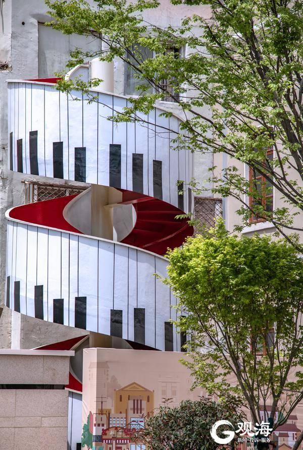 钢琴图案的旋转楼梯,为街区增添了艺术感。