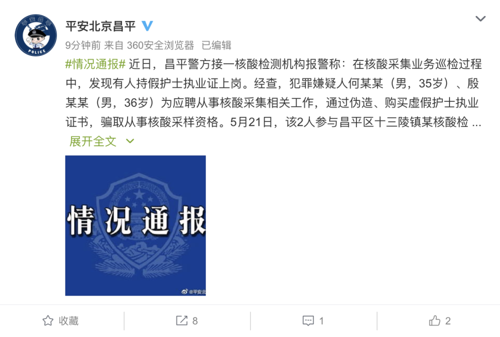 近日,昌平警方接一核酸检测机构报警称:在核酸采集业务巡检过程中,发现有人持假护士执业证上岗。经查,犯罪嫌疑人何某某(男,35岁)、殷某某(男,36岁)为应聘从事核酸采集相关工作,通过伪造、购买虚假护士执业证书,骗取从事核酸采样资格。5月21日,该2人参与昌平区十三陵镇某核酸检测点采样工作时,被检测机构巡检工作人员发现其资格造假,后被昌平警方抓获。目前,何某某、殷某某已被昌平公安分局依法采取刑事强制措施,案件正在进一步工作中。