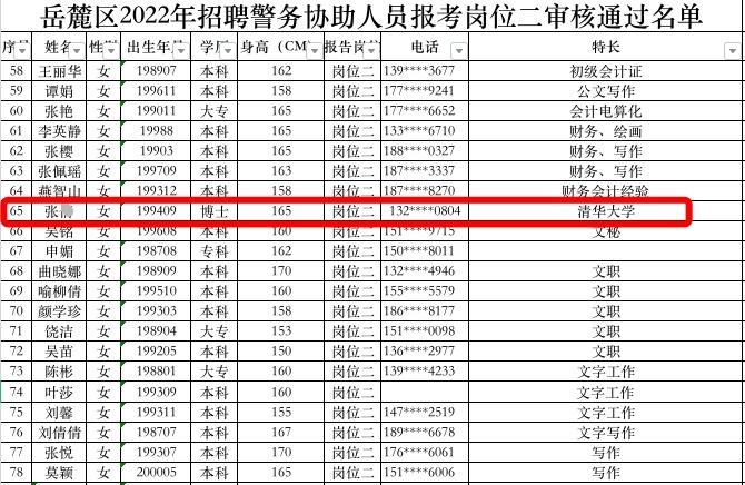 当天有媒体报道称,近日网友爆料,有清华博士生报考长沙市岳麓区协警岗位。据岳麓区人民政府官网5月21日中午12点公布的《岳麓区2022年招聘警务协助人员报考审核通过名单公告》显示,在通过“警务协助人员岗位二”审核的人员表格中,出现了众多本科硕士人员,其中最高学历为一位1994年出生的张姓女博士(特长备注为“清华大学”),另有研究生10人,本科349人。