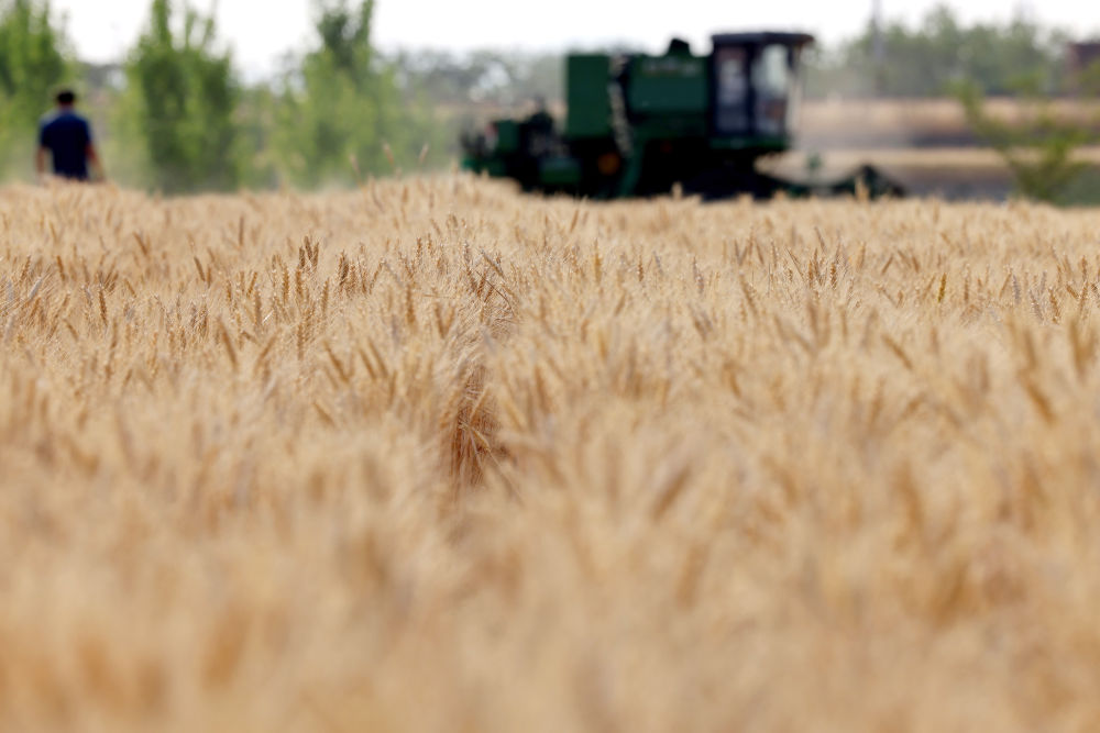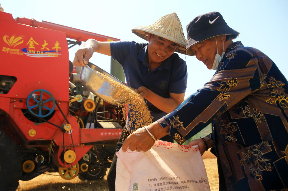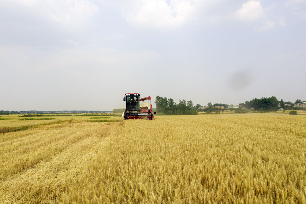 5月23日,在安徽省淮北市烈山区烈山镇,农民在麦田里收获小麦。新华社发(万善朝 摄)