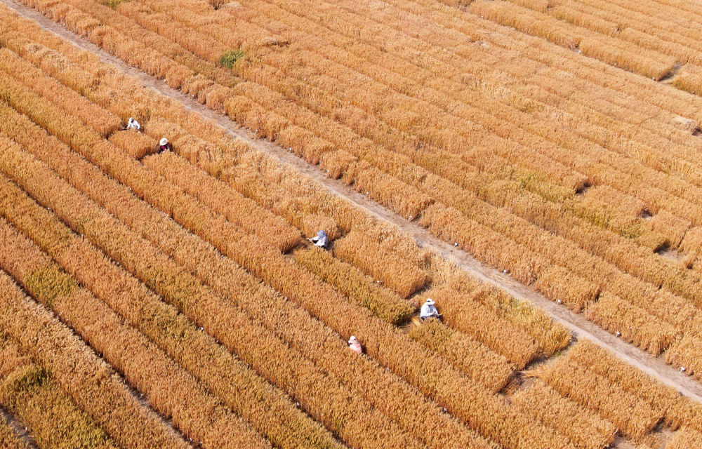 5月21日,农民在位于江苏扬州的里下河地区农科所试验田里收割小麦(无人机照片)。新华社发(孟德龙 摄)