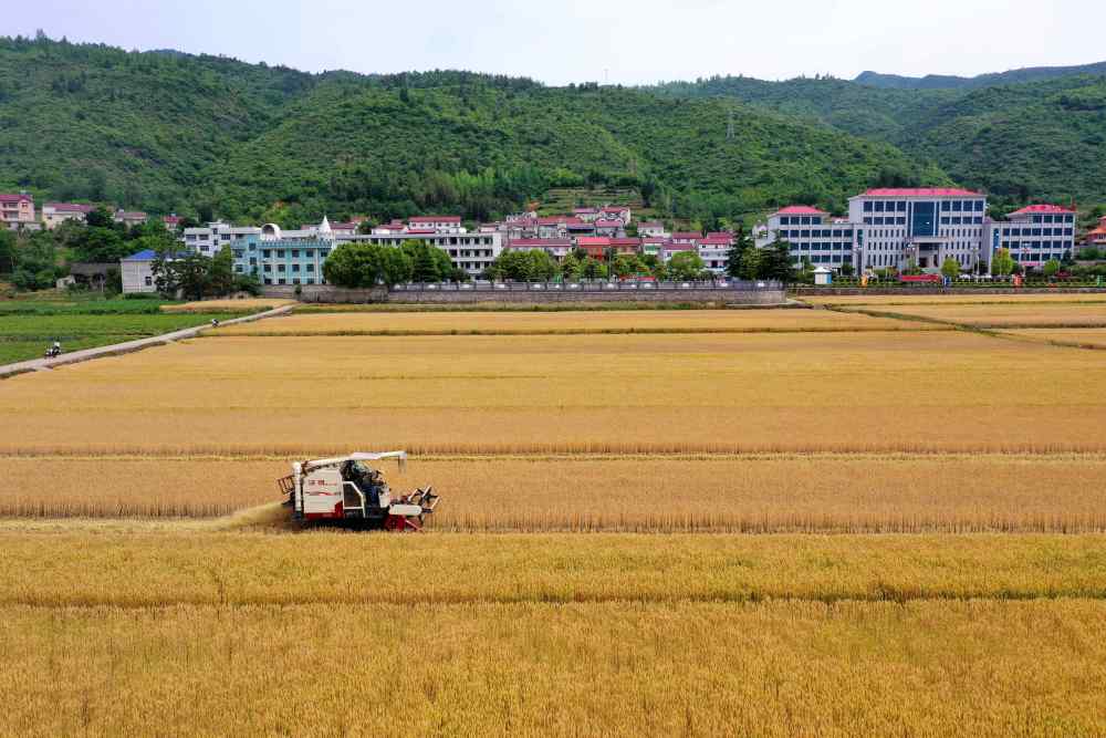 5月21日,在湖北省襄阳市保康县马桥镇中坪村,农民驾驶农机收割小麦(无人机照片)。新华社发(杨韬 摄)