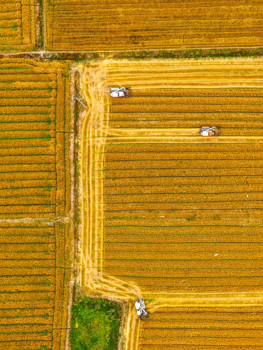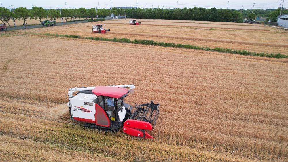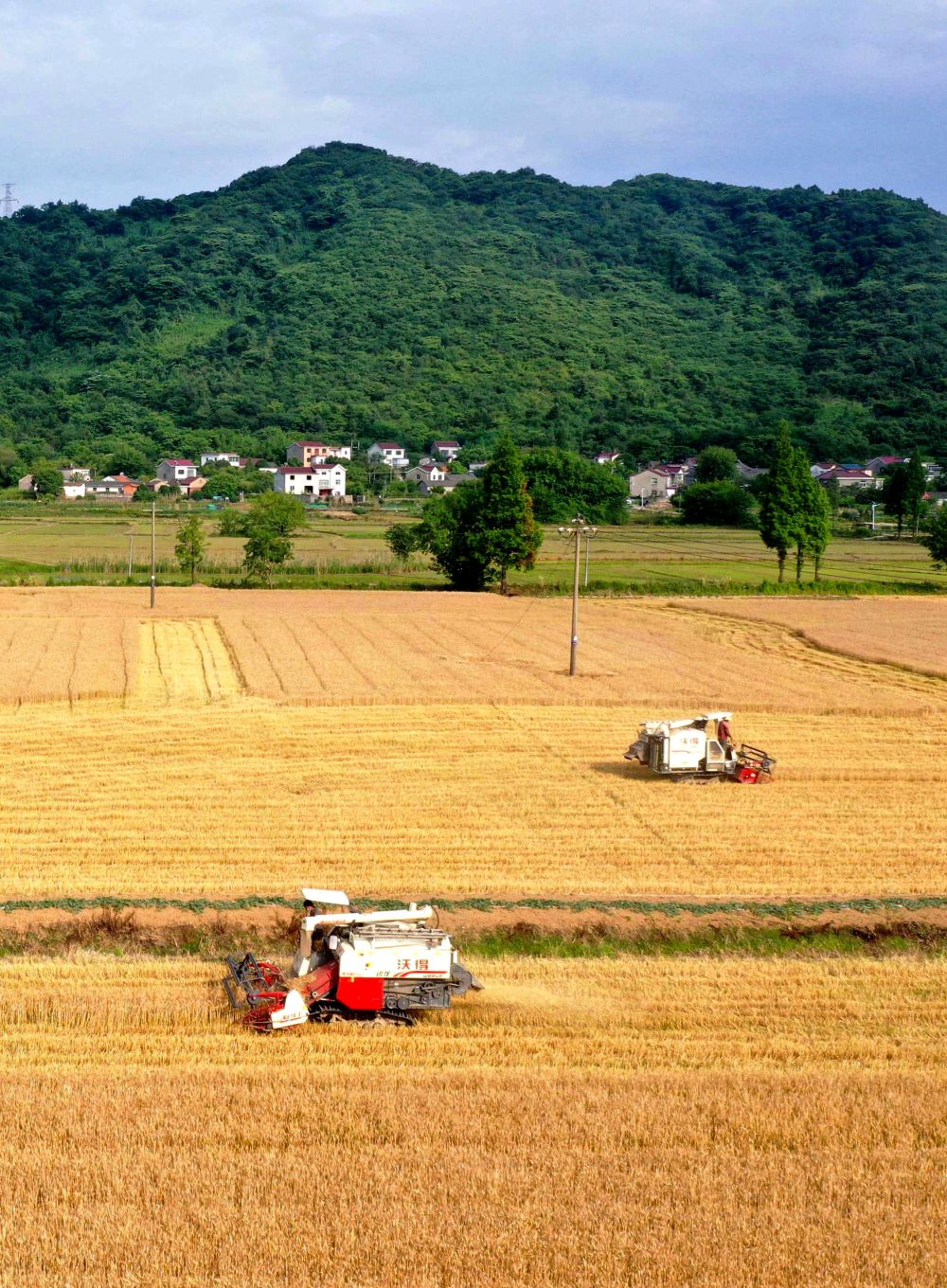 5月21日,在浙江省湖州市长兴县画溪街道长桥村,农民驾驶收割机收割小麦(无人机照片)。新华社发(吴拯 摄)