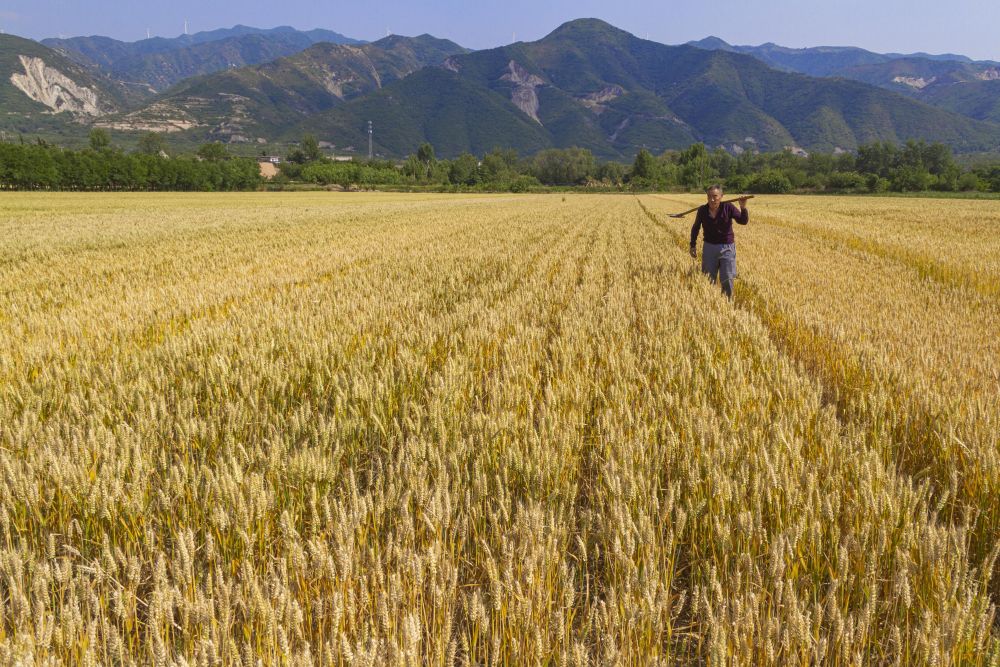 5月21日,在河南省南阳市红泥湾镇大叶岗村,农民在田间查看小麦长势。新华社发(高嵩 摄)