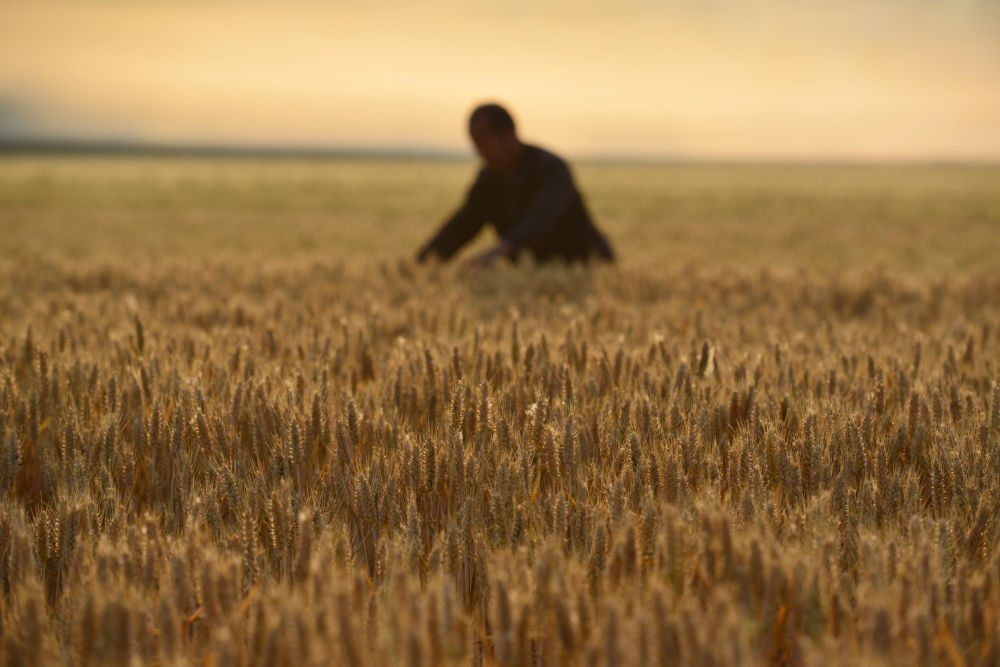 5月21日,在江苏省连云港市朝阳街道韩李村,农民在田间查看小麦长势。新华社发(王春 摄)