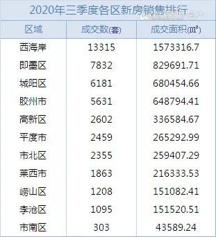 从青岛各区市新房成交量来看,三季度近郊板块依然在新房市场中占据主要地位。其中,西海岸三季度新房成交13315套,占全市成交总量的30%,稳居冠军,成交面积1573316.7㎡;即墨紧随其后,三季度新房供成交7832套,位居亚军,新房成交量占比全市总成交量17%,新房成交面积达829691.71㎡;城阳区位列区域成交季军,三季度共成交新房6181套,占比全市总成交量14%,新房总成交面积为480454.66㎡。
