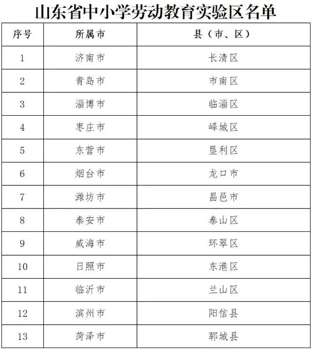 青岛日报社/观海新闻5月29日讯 近日,山东省教育厅官网公示山东省中小学劳动教育实验区和劳动教育实验学校名单,拟认定青岛市市南区等13个县(市、区)为山东省中小学劳动教育实验区,青岛市城阳区第二实验中学等32所学校为山东省中小学劳动教育实验学校 。公示期为2022年5月25日至5月31日。