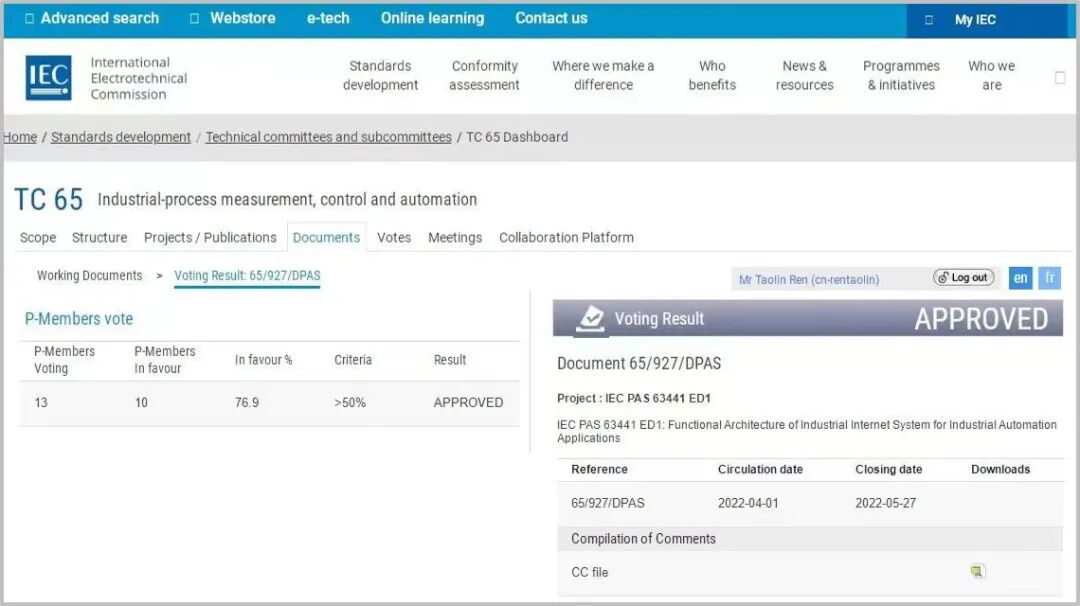 青岛日报社/观海新闻5月30日讯 北京时间5月28日凌晨,IEC官网公布,由卡奥斯COSMOPlat联合机械工业仪器仪表综合技术经济研究所(以下简称仪综所)牵头制定的全球首个工业互联网系统功能架构国际标准IEC PAS 63441《Functional Architecture of Industrial Internet System for Industral Autornation Applications》通过IEC/TC65(工业测控和自动化)投票,预计在2022年年底正式发布。