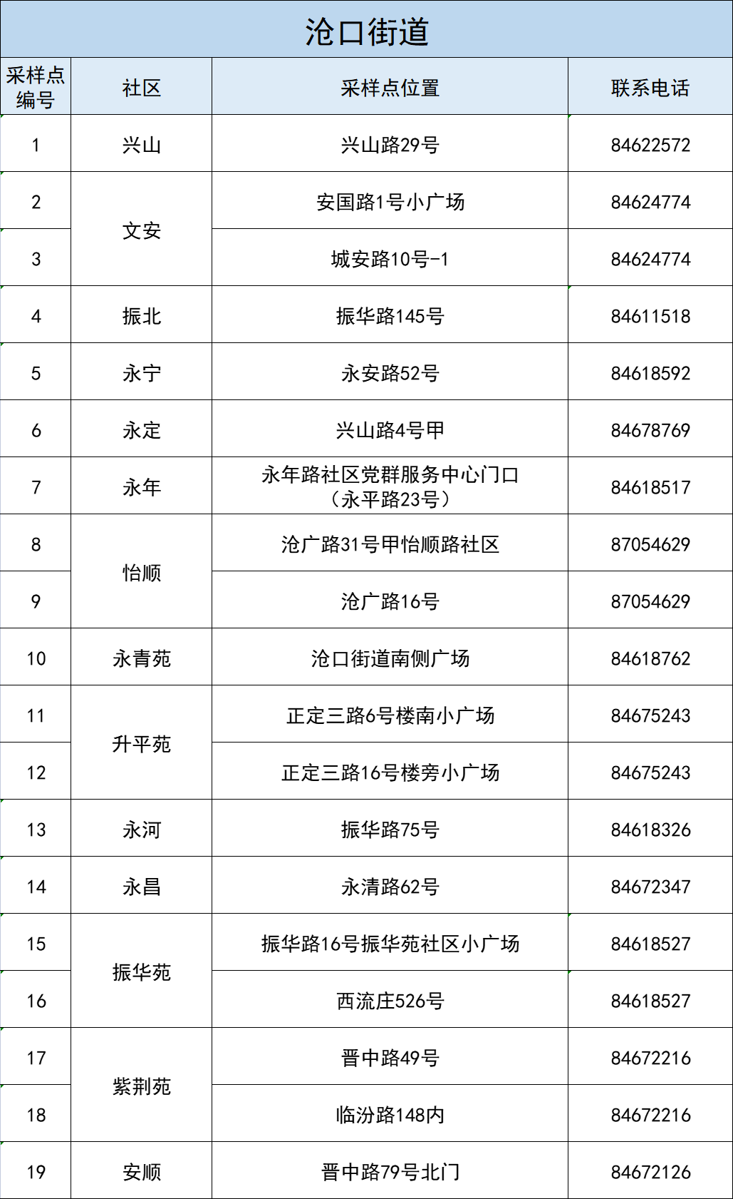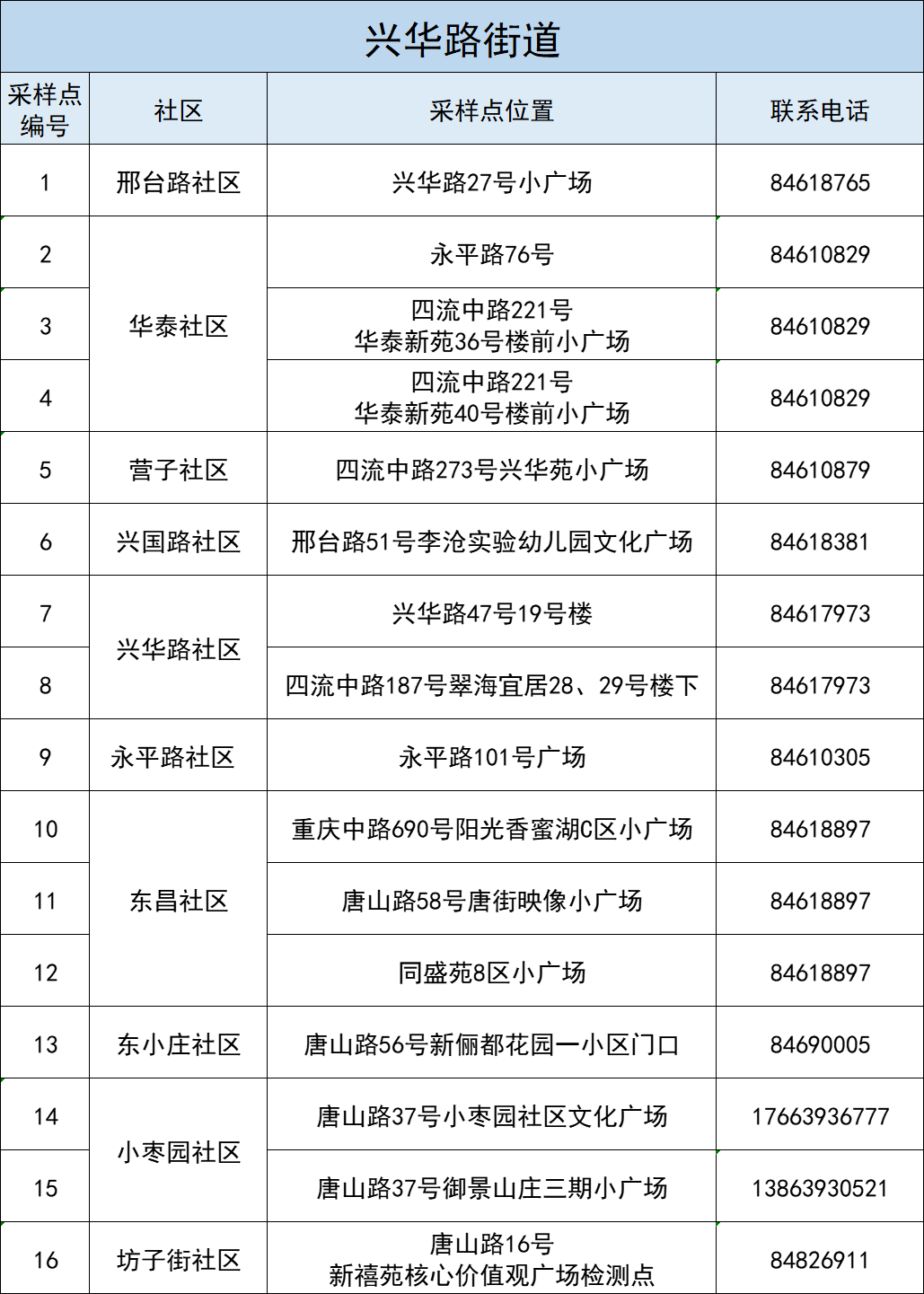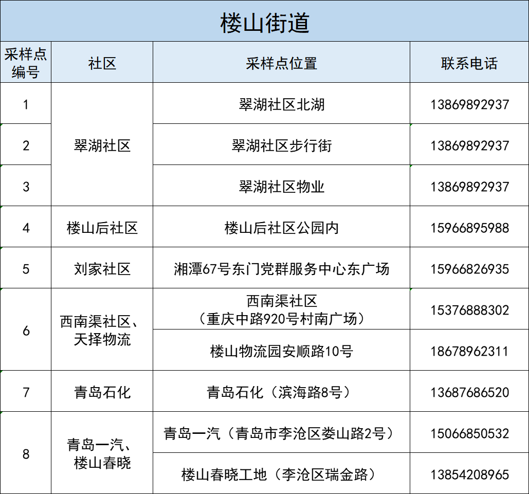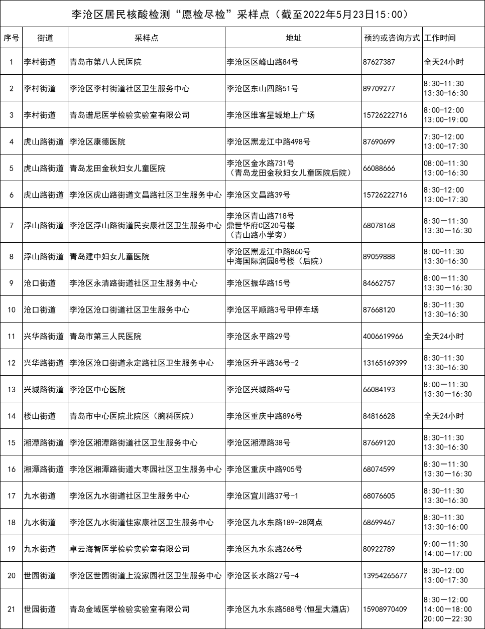 李沧区全体居民核酸检测采样点一览表