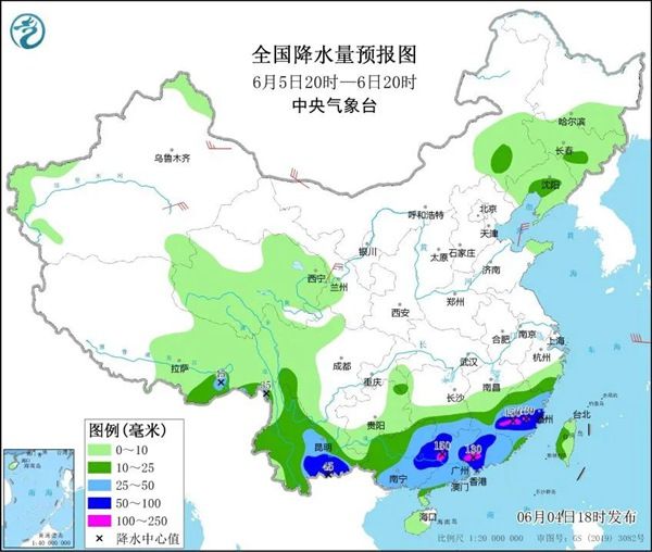 5日20时至6日20时,西南地区南部、江南南部、华南大部、辽宁南部等地的部分地区有中到大雨,其中,云南南部、广西东部、广东中部、福建中部等地的部分地区有暴雨,局地大暴雨(100~150毫米)。