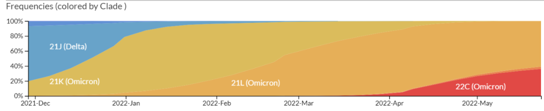 extstrain网站截图。依据已上传测序数据,去年12月以来,奥密克戎主流分支从BA.1(图示为21K)到BA.2(图示为21L),正逐渐转为到BA2.12.1(图示为22C),新分支所占面积也在不断扩大。
