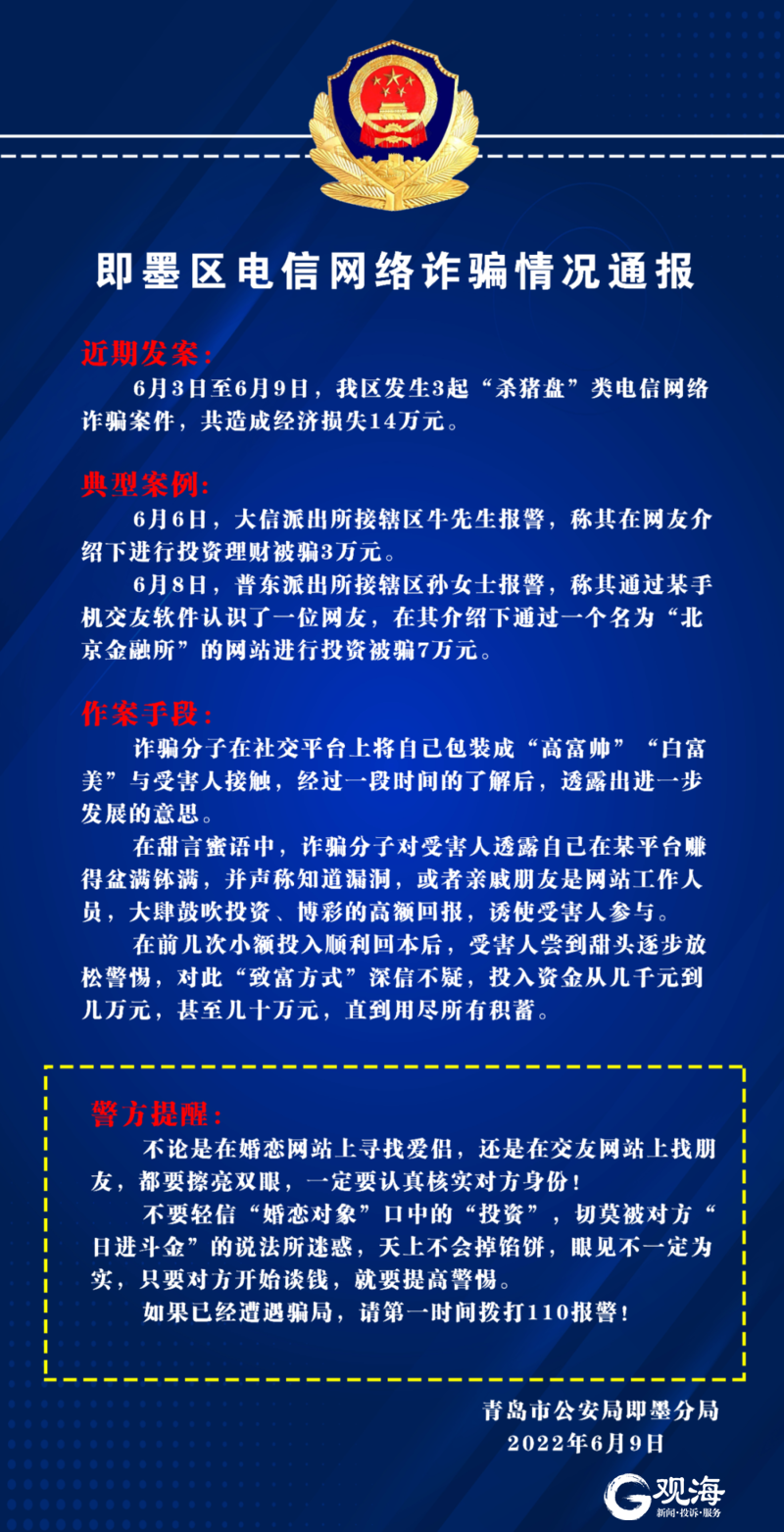 青岛日报社/观海新闻6月11日讯 近日,市公安局即墨分局发布近期即墨区电信网络诈骗情况通报,6月3日至6月9日,即墨区发生3起“杀猪盘”类电信网络诈骗案件,共造成经济损失14万元。