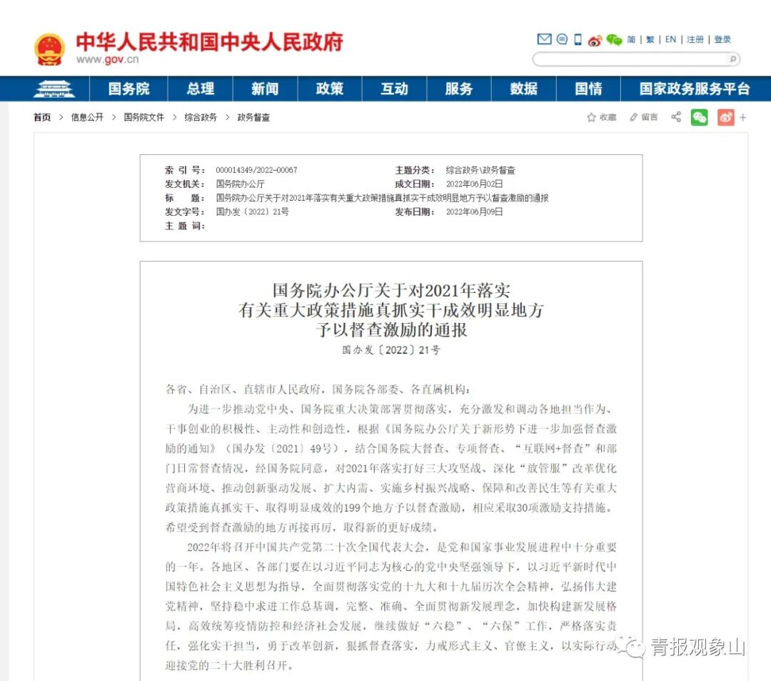 6月9日,国务院办公厅印发《关于对2021年落实有关重大政策措施真抓实干成效明显地方予以督查激励的通报》。