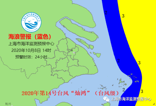 同样受台风“灿鸿”(台风级)影响,今天(8日)14时,上海市海洋监测预报中心发布海浪蓝色警报。