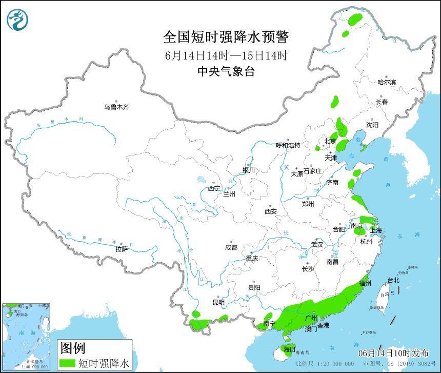 预计6月14日14时至15日14时,辽宁南部、河北东部、天津东部、山东北部和南部、安徽北部和中南部、江苏、上海、浙江北部、广东南部等地的部分地区将有8-10级雷暴大风或冰雹天气;内蒙古东南部、黑龙江西北部、辽宁南部、河北东北部、山东南部、安徽东南部、江苏、上海北部和西部、浙江北部、福建东南部、云南南部、广西东南部、广东、海南岛中东部等地的部分地区将有短时强降水天气,小时雨量30-60毫米,局地可达80毫米以上。