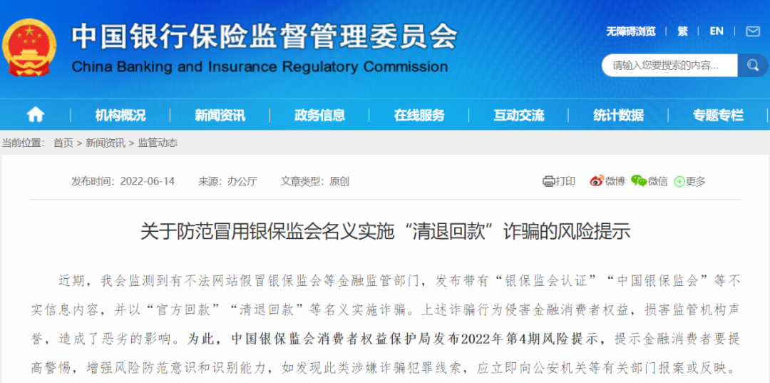 6月14日,中国银保监会网站发布《关于防范冒用银保监会名义实施“清退回款”诈骗的风险提示》。