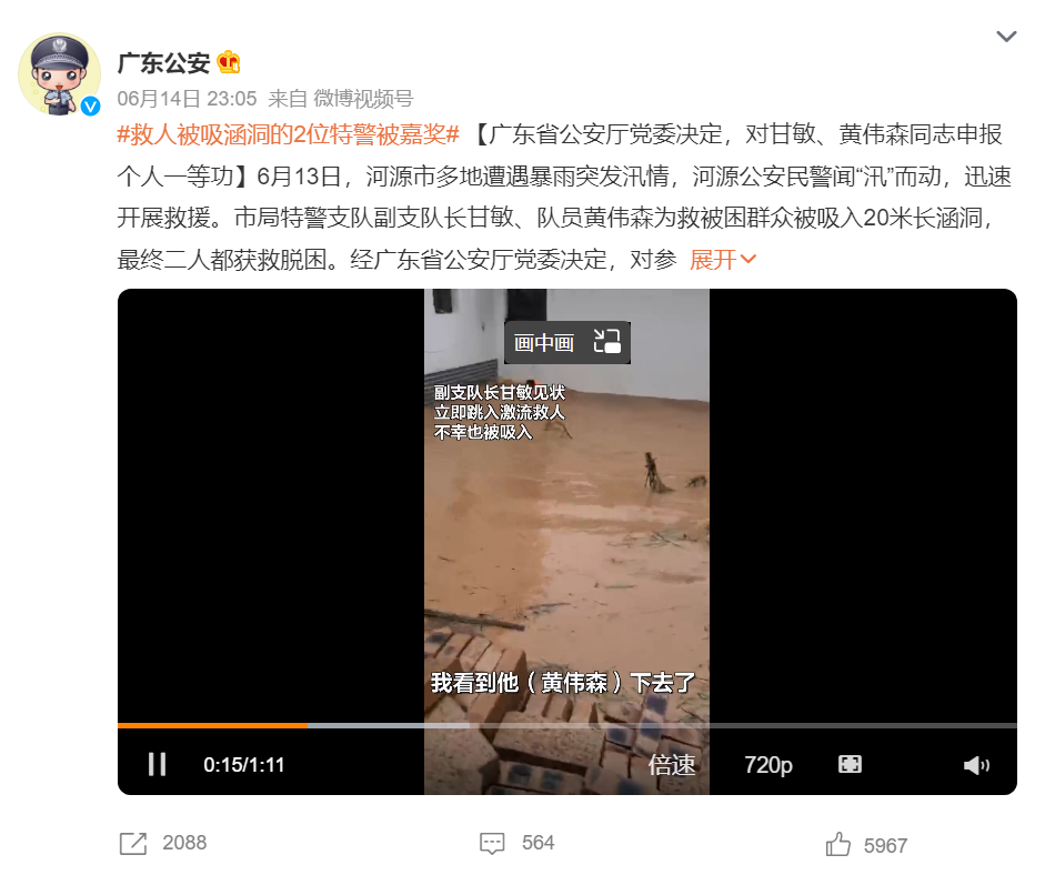 6月13日,河源市多地遭遇暴雨突发汛情,河源公安民警闻“汛”而动,迅速开展救援。市局特警支队副支队长甘敏、队员黄伟森为救被困群众被吸入20米长涵洞,最终二人都获救脱困。经广东省公安厅党委决定,对参与救援的河源市公安局特警支队通令嘉奖,为表现特别英勇的甘敏、黄伟森同志申报个人一等功。